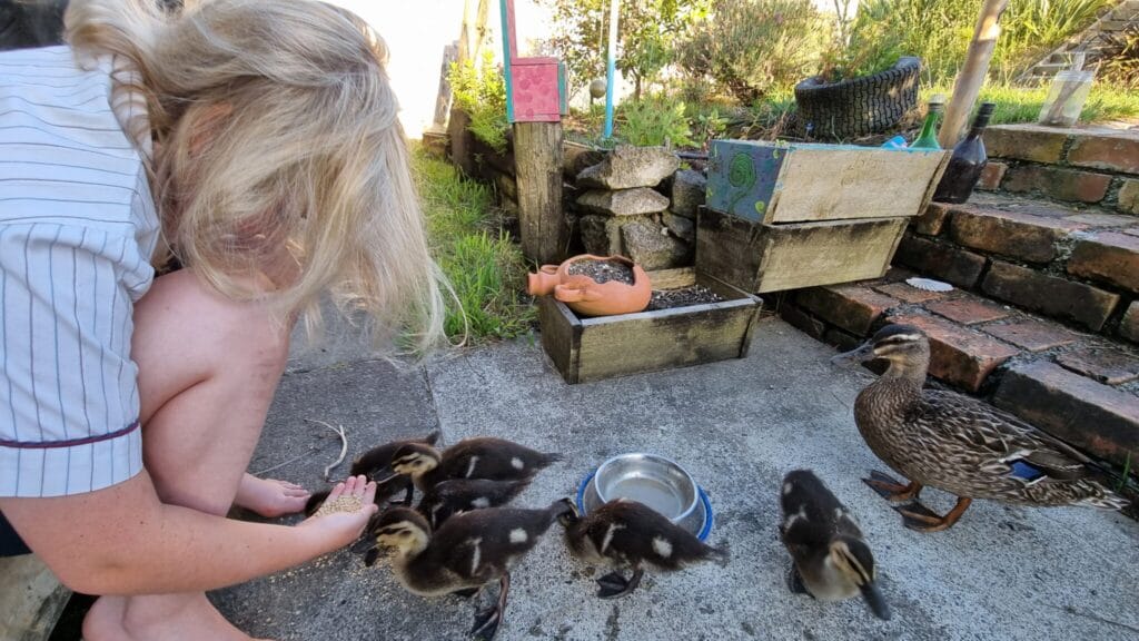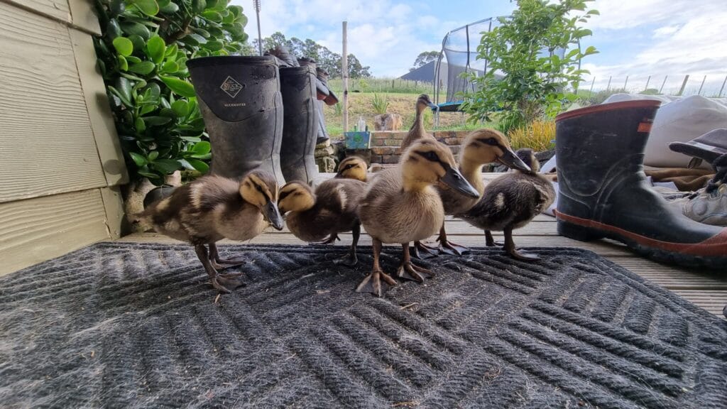 The little ducklings have grown over the last couple of days and become so docile, or should I rather say they’ve sussed out where the food comes from…. As the chirping got louder and louder we were quick to find out why… the little duckling Squat Squad had decided to venture indoors… not just once… they’re pretty cute, but well they’re messy ducks, so out they had to go again. They have come inside quite a few times to look for the humans with the food bucket.